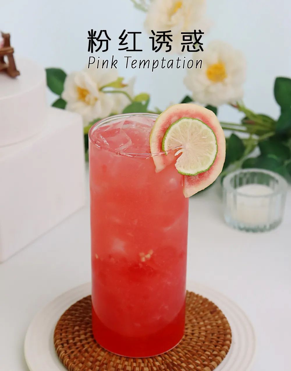 Pour 100g of strawberry magic rice into a 500cc serving cup, add 150g of ice cubes, insert a slice of red guava into the wall of the cup, then pour in 200ml of guava lemon tea, and insert a slice of lemon and a slice of red guava on the edge of the cup.