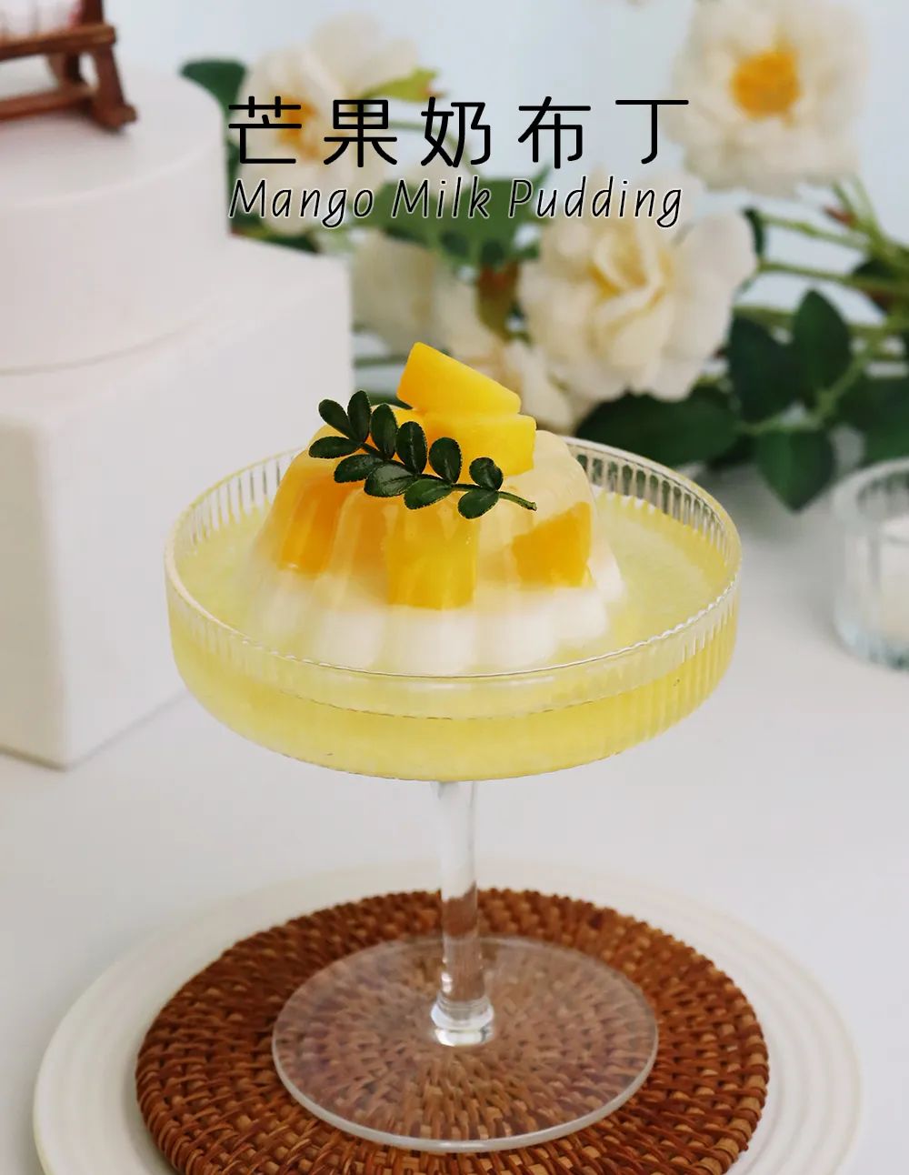 Put the pudding in a serving bowl, squeeze 30g of mango magic rice on top, and then add chopped mango and pepper wood.