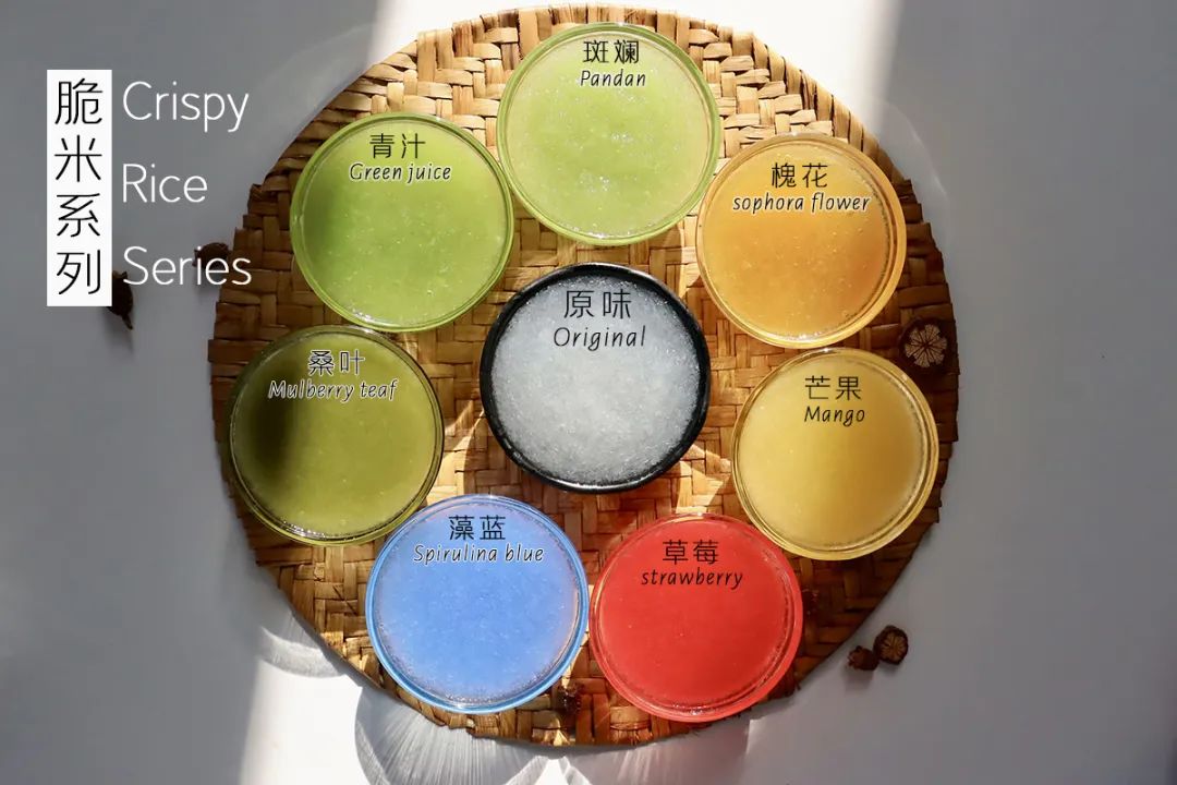 Crispy rice series: pandan flavor, green juice flavor, mulberry leaf flavor, locust flower flavor, mango flavor, strawberry flavor, algae blue flavor, original flavor.