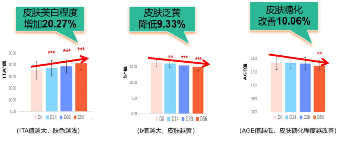 Efficacy: relieve anxiety, benefit sleep; anti-inflammatory, antioxidant; scientific anti-aging, prolonging life. Significantly increases skin moisture content, enhances skin barrier, and improves skin roughness; brightens skin tone, reduces yellowing and glycation levels; increases eye corner firmness and reduces eye wrinkles. It takes effect in 14 days and is significantly improved in two months.