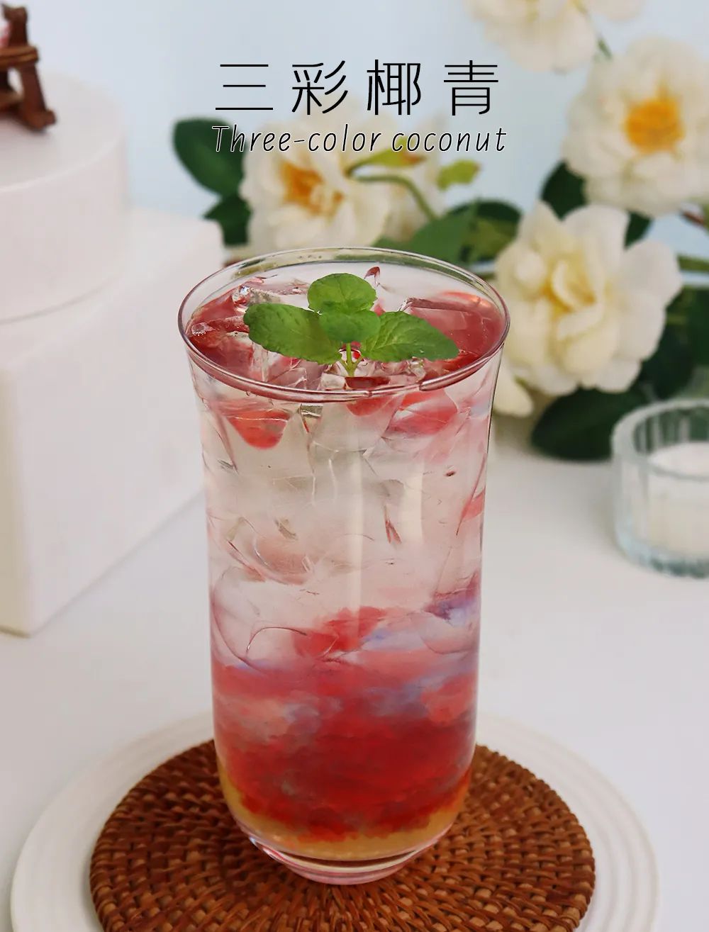 In a 400cc serving cup, pour 50g of mango fiber, 50g of ice cubes, 50g of algae fiber, 50g of ice cubes, and 50g of strawberry fiber in sequence, then pour in 200ml of coconut water and place a bunch of mint leaves on top.