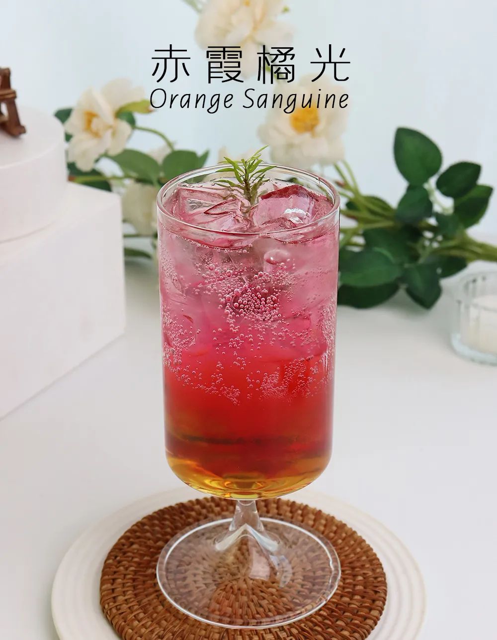 Pour 100g of Sophora japonica magic rice into a 400cc serving cup, add 100g of ice cubes, then add 200ml of sparkling water, slowly pour 30ml of cherry blossom water on top, and finally put a bunch of willow buds for decoration.