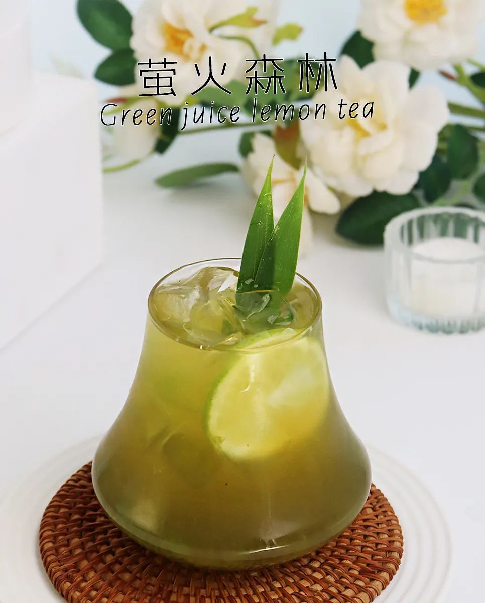 Pour 50g of green juice magic rice and 50g of mulberry leaf magic rice into a 300ml serving cup, add 100g of ice cubes, insert a slice of lemon into the wall of the cup, and fill it with lemon tea.